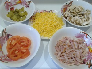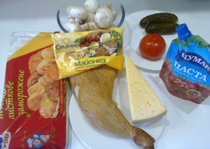 Соленый огурец нарезать тонкими кольцами. Твердый сыр натереть на крупную терку. С шампиньонов аккуратно снять кожуру, и тонко нарезать вдоль. Помидор обдать кипятком, после чего на стороне, противоположной плодоножке, сделать небольшой крестообразный разрез ножом, и аккуратно снять кожицу помидора. С копченого окорока снять шкурку, отделить мясо от кости и нарезать соломкой (в рецепте использована половина окорока).
