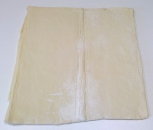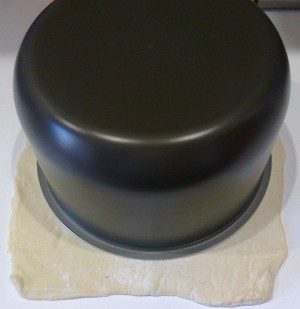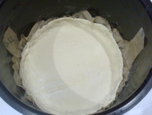 Замороженное тесто предварительно вынуть из холодильника и дать ему разморозиться, чтобы оно приобрело пластичность. Немного раскатать тесто, таким образом, чтобы оно с одной стороны не получилось слишком тонким, а с другой корж из теста был размером больше диаметра чаши мультиварки.