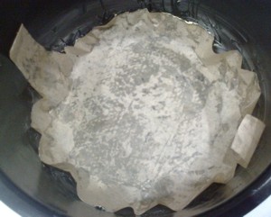 Сливочным маслом смазать дно чаши мультиварки. Выложить на дно вырезанную форму из пекарской бумаги.