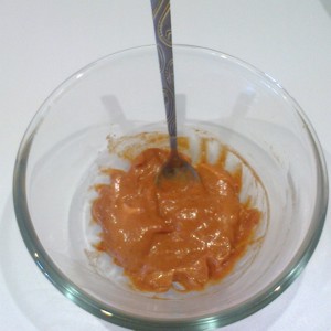 Подготовить пропитку для пиццы, для этого смешать в отдельной посуде по 3 столовых ложки майонеза и томатной пасты (кетчупа), посолить, поперчить по вкусу.