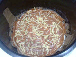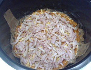 На приготовленную основу выложить твердый сыр (примерно третью часть).
